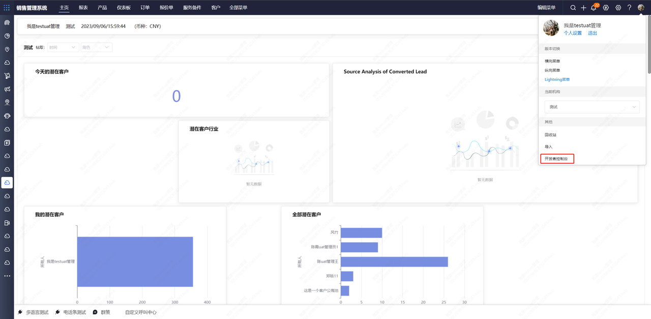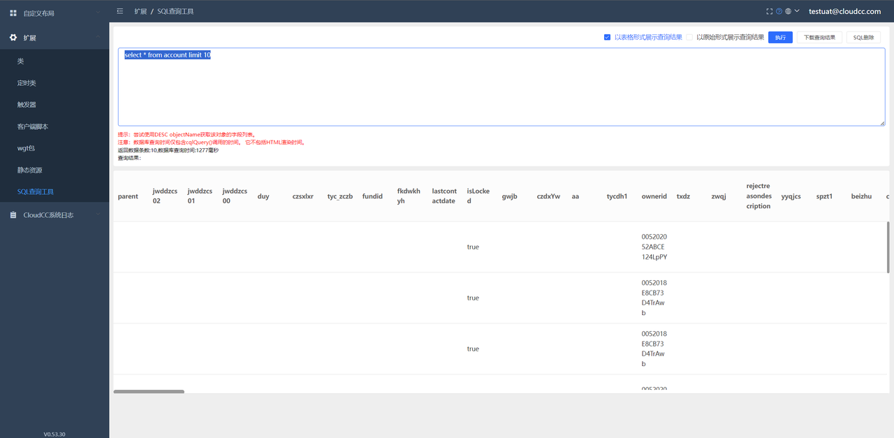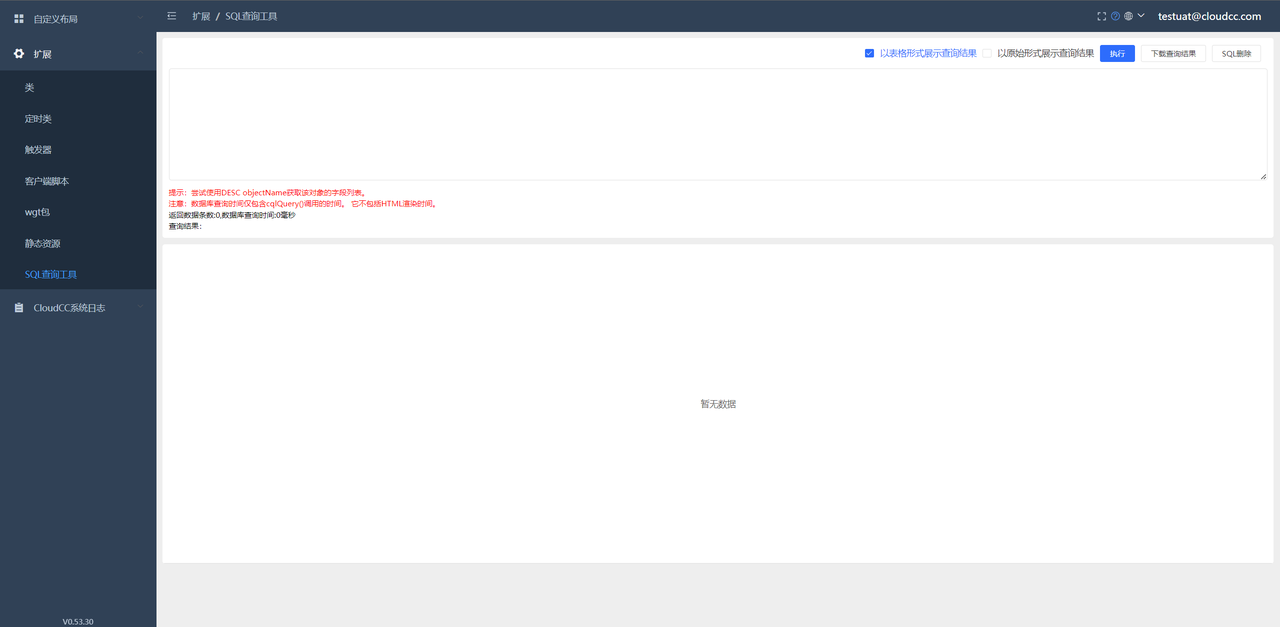 SQL查询工具 介绍 为方便实施人员,通过sql查询数据,提供本功能 SQL查询工具页面入口登录系统,点击右上角人头像,选择开发者平台按钮,此按钮目前只开放给管理员简档用户。选择左侧:扩展——》SQL查询工具查询select * from account limit 10使用场景类定时类 Previous Next